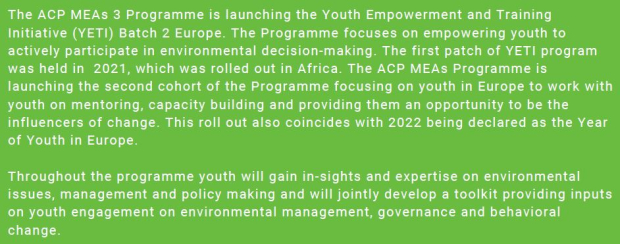 ACP MEAs (UNEP) is searching for potential mentees around Europe (16-30 years) with high interest in environmental management and governance and an ambition to be the influencers of pro-environmental change.