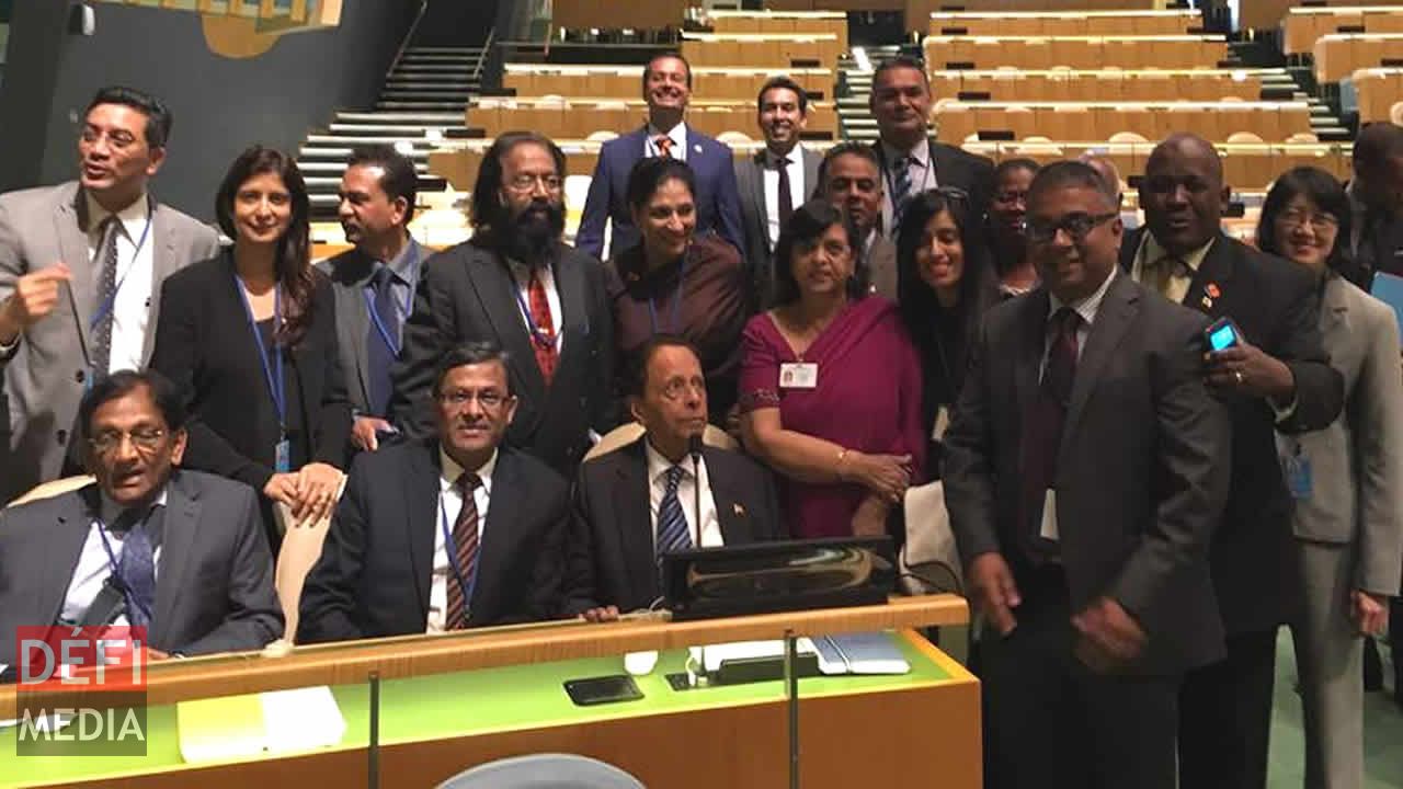 Photo souvenir de la délégation mauricienne menée par le ministre Mentor, sir Anerood Jugnauth, après l’adoption de la résolution mauricienne au siège de l’Onu ce jeudi soir 22 juin 2017.