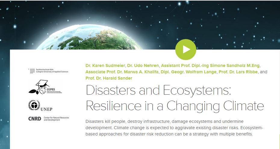 It was developed jointly by the United Nations Environment Programme (UNEP), the Center for Natural Resources and Development (CNRD) and the Cologne University of Applied Sciences (CUAS), Germany. This is UNEP's first MOOC, developed in the context of its engagement with universities worldwide including the Global Universities Partnership on Environment for Sustainability (GUPES). The course covers a broad range of topics from disaster management, climate change, ecosystem management and community resilience.