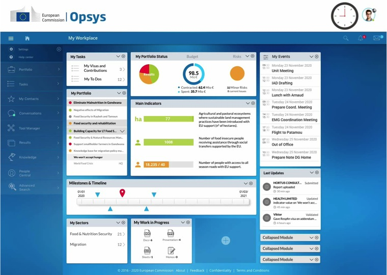 Etienne works from his office in Gondwana and thanks to his personalised entry page "My Workspace", he can visualise the status of his portfolio, including milestones, indicators and he can check his upcoming events and pending tasks. OPSYS will also alert him of pending and overdue actions.
