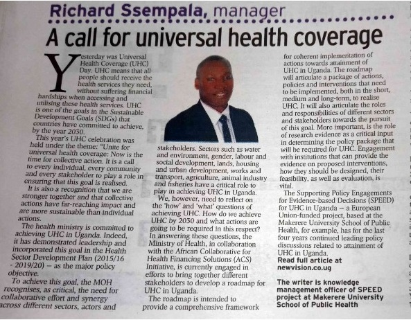 Other activities SPEED engaged in on the UHC day celebrations included; writing of a newspaper article. In this article Mr. Richard Ssempala, stressed the need for collaborative efforts from all stakeholders if UHC is to be realised in Uganda.
