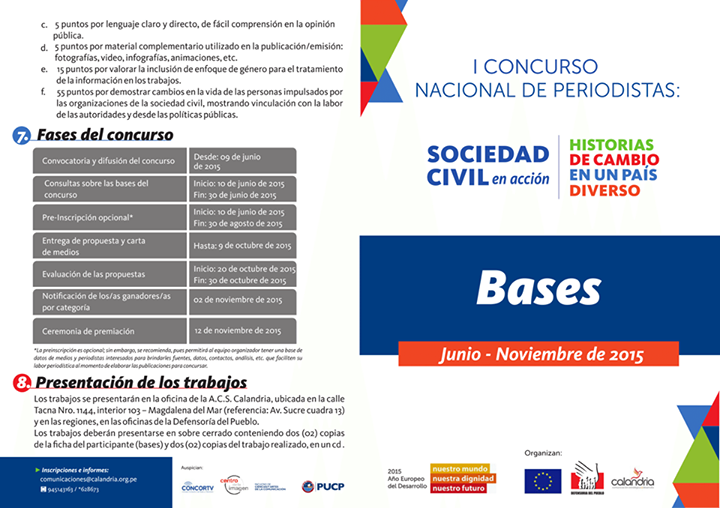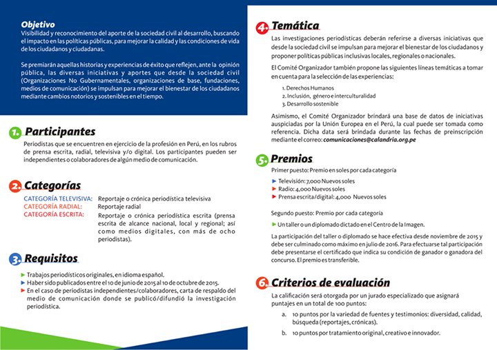 Las bases del concurso están a disposición de los interesados desde el martes, 09 de junio en las redes sociales de la Delegación de la Unión Europea en Perú, la Defensoría del Pueblo y de la A.C.S. Calandria. En ellas se establece el procedimiento del concurso, los requisitos de calificación y los lugares donde se pueden presentar las investigaciones periodísticas.