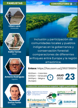 En el marco de las acciones de la REDPARQUES y en colaboración con el programa Amazonía+ FAO y Europarc se ha programado para el 23 de julio el webinar titulado : Inclusión y participación de comunidades locales y pueblos indígenas en la gobernanza y conservación forestal: comparaciones entre Europa y la región amazónica. (En la franja horaria 9:00 ama Quito- Lima- Bogotá).
