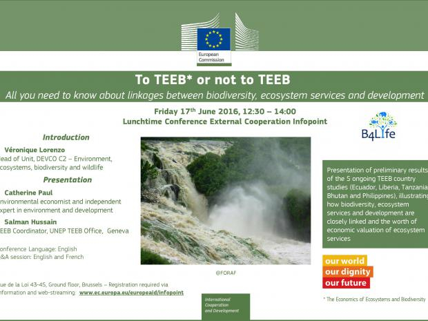 This conference organised at the External Cooperation Infopoint on 17 June 2016 will present findings and examples from The Economics of Ecosystems and Biodiversity (TEEB) study (see website), and preliminary results from five ongoing TEEB country studies (Ecuador, Liberia, Tanzania, Bhutan and Philippines).
