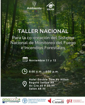 La gestión de incendios forestales es un pilar central de la política climática de Colombia. Para avanzar en el cumplimiento de las primeras cuatro estrategias de la meta de Incendios Forestales de la Contribución Determinada a Nivel Nacional (NDC) y la ley de acción climática 2169 de 2021, es imperativo pasar de herramientas fragmentadas a un sistema nacional unificado. El desafío actual radica en la dispersión de información y la falta de un modelo conceptual común que integre las capacidades y necesidades de todas las entidades del orden nacional y territorial. Para responder a este desafío, se ha puesto en marcha la consultoría "Brindar asistencia técnica especializada para la co-creación del modelo conceptual del Sistema Nacional Integrado de Monitoreo, Pronóstico y Detección de Incendios Forestales", impulsado por el programa Amazonia+, financiado por la Unión Europea. En el marco de este ejercicio, es fundamental asegurar la incorporación de las necesidades del país a través de la realización de este Taller Nacional de Co-creación del diseño conceptual del sistema, estructurándolo a través de cuatro módulos tecnológicos funcionales claves. En este sentido, Ministerio de Ambiente y Desarrollo Sostenible a través de la Dirección de Cambio Climático y Gestión del Riesgo y el Instituto de Hidrología, Meteorología y Estudios Ambientales (IDEAM) tienen el gusto de invitarle a participar en este importante taller, el cual es posible gracias a la articulación con el proyecto "Fortaleciendo la reducción de riesgos y preparación ante incendios - GCP /GLO/1351/CAN" (gestionado por el Global Fire Hub de la FAO con el financiamiento del Gobierno de Canadá), así como con el programa Amazonia+ (financiado por la Unión Europea) y el programa Probosques II de la agencia de cooperación alemana GIZ, con el objetivo de lograr las metas propuestas.