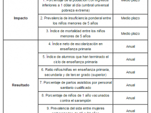 Asimismo, la Comisión Europea aconseja restringir la lista de indicadores y centrarse en los esenciales. Finalmente, se insta a comprobar la fiabilidad de los indicadores. Lista de indicadores Para la medición de los resultados de las políticas del país en materia de reducción de la pobreza y mejora de las condiciones de vida, se propone trabajar de forma sistemática con una lista de 10 indicadores clave, extraídos de la lista de indicadores de los Objetivos del Milenio. Lista de indicadores de la Dirección General de Desarrollo de la Comisión Europea para la evaluación de desempeño de la cooperación con un país