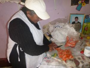 Mrs. Rosa Lopez Perez, 51 years old, is a beneficiary of the project "Production with Education, an alternative for Decent Work in Social Inclusion" run by FAUTAPO Foundation. Rosa Lopez belongs to the food category: she uses to sell “rellenos” in the morning, while, for the rest of the day, she is engaged with the preparation of “salsichas con papas y pollo frito” (sausages with potatoes and fried chicken) directly sold on a provisional market stall half a block from her house. |