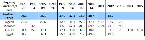 Table 2: Share of employment in the informal economy in total non-agricultural employment by 5-year period and by year since 2010 in Northern Africa.