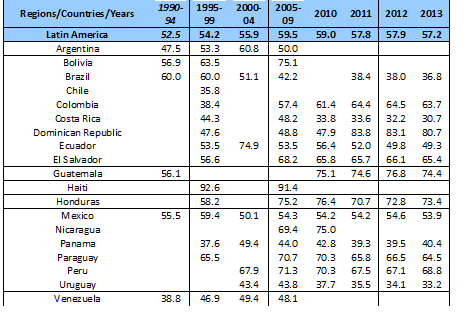 On average for the region, the most recent period is characterised by a considerableincrease of employment in the informal economy, growing from 47.3% at the beginning of the 2000s to 53.0% at the end of the decade.