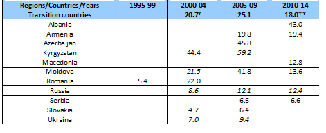 Table 6: Share of employment in the informal economy in total non-agricultural employment by 5-year period in transition countries.