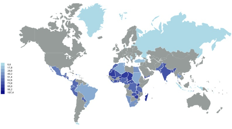 A deeper insight into the variability at regional and national level is provided at Figure 3 that illustrates the intra-regional variation in the extent of informality. The first panel depicts the extent of informality on a light blue-dark blue scale, the darker tones corresponding to a higher extent of informality. The second panel depicts the same indicator using a pairwise scheme allocating the same colours to the countries with similar extent of informality. The figure documents that there is no uniform pattern within various regions. In each continent or in each major region one can find countries with similar extent of informality. There is also no obvious North-South divide, neither East-West divide. The intra-regional variation in terms of informal economy incidence is large. One can find countries with very high and very low incidence of informal economy within the same geographic region.
