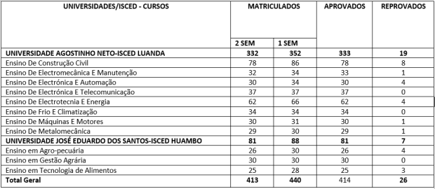 Os Cursos de Bacharelato em Ensino, desenvolvidos no quadro do projecto RETFOP, com o apoio financeiro da União Europeia, e que decorrem nas Universidades Agostinho Neto-ISCED de Luanda e José Eduardo dos Santos-ISCED de Huambo, registaram no 1º semestre do ano académico 2020/2021 uma taxa de aprovação geral de 94,1%, sendo 94.6% na UAN e 92% na UJES.