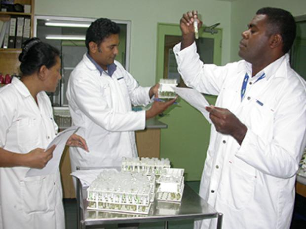 Photo caption: Cultures being inspected and released by Dr Visoni Timote, Plant Pathologist and Manager Standards, Policy and Compliance, and Joseva Takiveikata, Biosecurity Officer of BAF, with CePACT Curator, Logotonu Waqainabete.