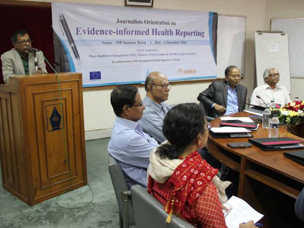Media landscape offers multiple influences in health sector. A well-articulated press release can hype up the research findings appropriately. Any impartial and objective media report can enhance knowledge translation towards health promotion and policy advocacy. While talking about such unique consequences of health journalism in recent journalists orientation programme, Ms. Catherine Spencer- Principal Communication Lead of icddr,b highlighted in her welcome remarks how journalism impacts health policy and spurs behavior change communication at community level. Considering this multiplier effect, European Union funded SHARE (Strengthening Health, Applying research Evidence ) project of icddr,b in collaboration with Press Institute of Bangladesh (PIB) organized an orientation training programme which offers journalists a chance to hone their skills on mainstreaming evidence-informed health reporting.