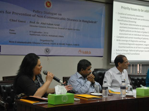 services for prevention of non-communicable diseases in Bangladesh. Prof. Dr. Abul Kalam Azad, Director General of DGHS attended the event as the Chief Guest and Dr. Omar Ali Sarker, WHO Bangladesh Programme Manager, NCDC, DGHS chaired the session. Dr. Mostafa Zaman, National NCD Coordinator, WHO Bangladesh was present as the special guest. Prof. M A Faiz, ex-DG, DGHS and Consultant, PIP, Ministry of Health & Family Welfare moderated the event and delivered a presentation on ‘Strategies for Prevention and Control of Non-communicable Diseases’ following a presentation by Dr. Aliya Naheed, Head, Initiative for Non Communicable Diseases, icddr,b on ‘Overview of the current scenario of NCDs. Dr. Sohana Shafique, Deputy Project Coordinator of icddr,b conducted the session as Master of Ceremony.